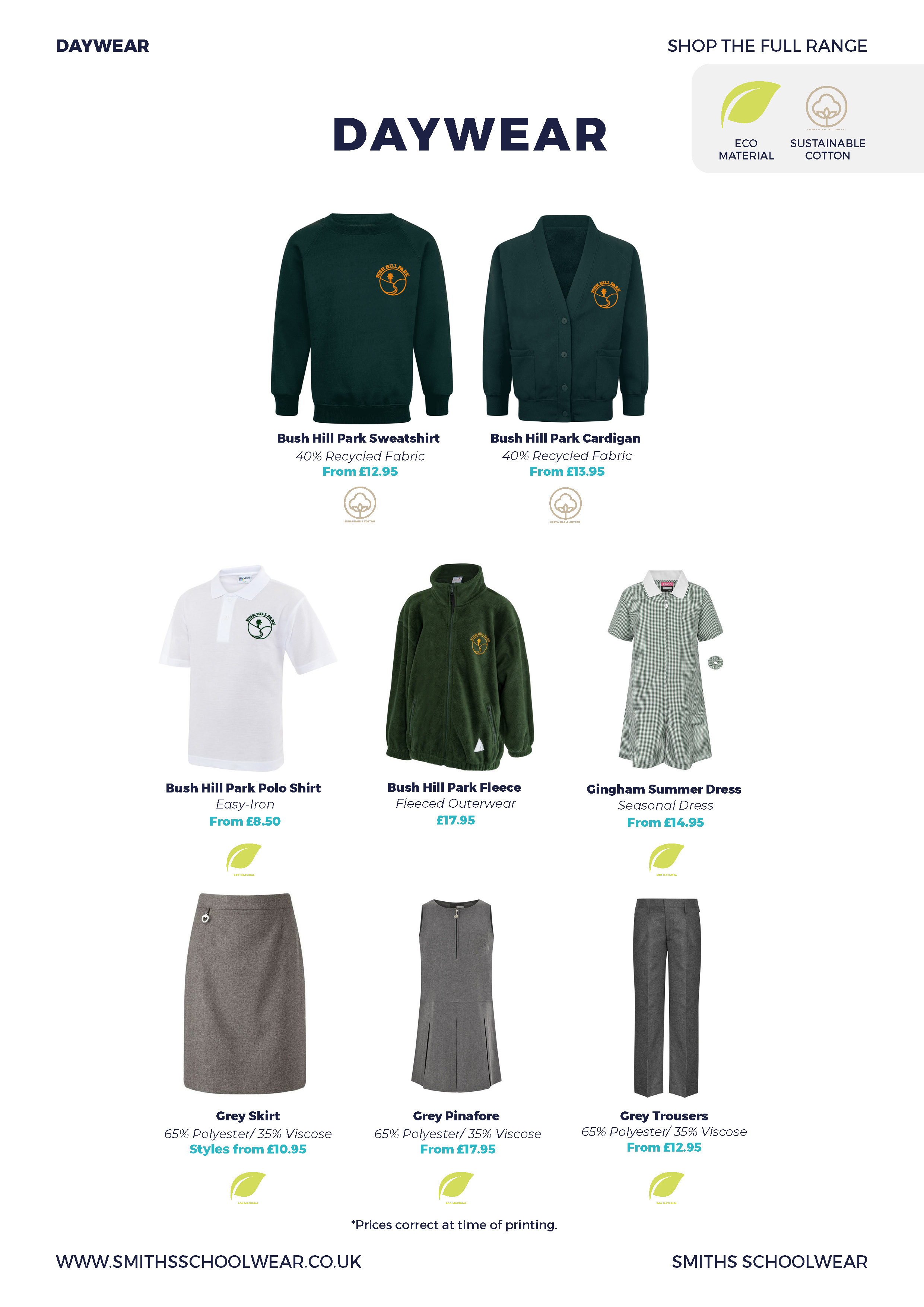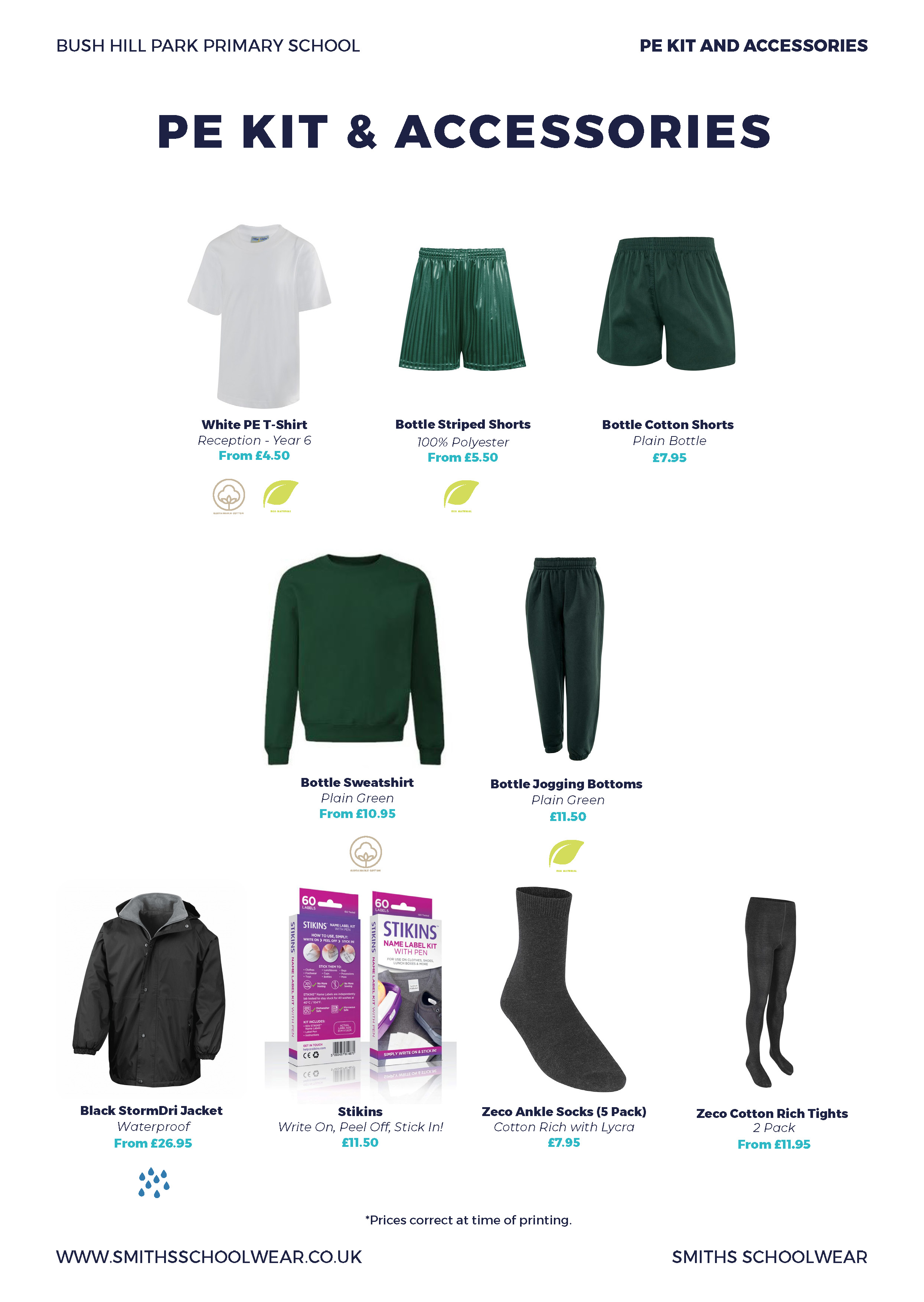 All children are expected to wear uniform as this builds a positive identity towards the school and learning. School uniform is smart and is practical for daily activities. We want our children to be recognised in the wider community and to be proud of wearing the Bush Hill Park School uniform.