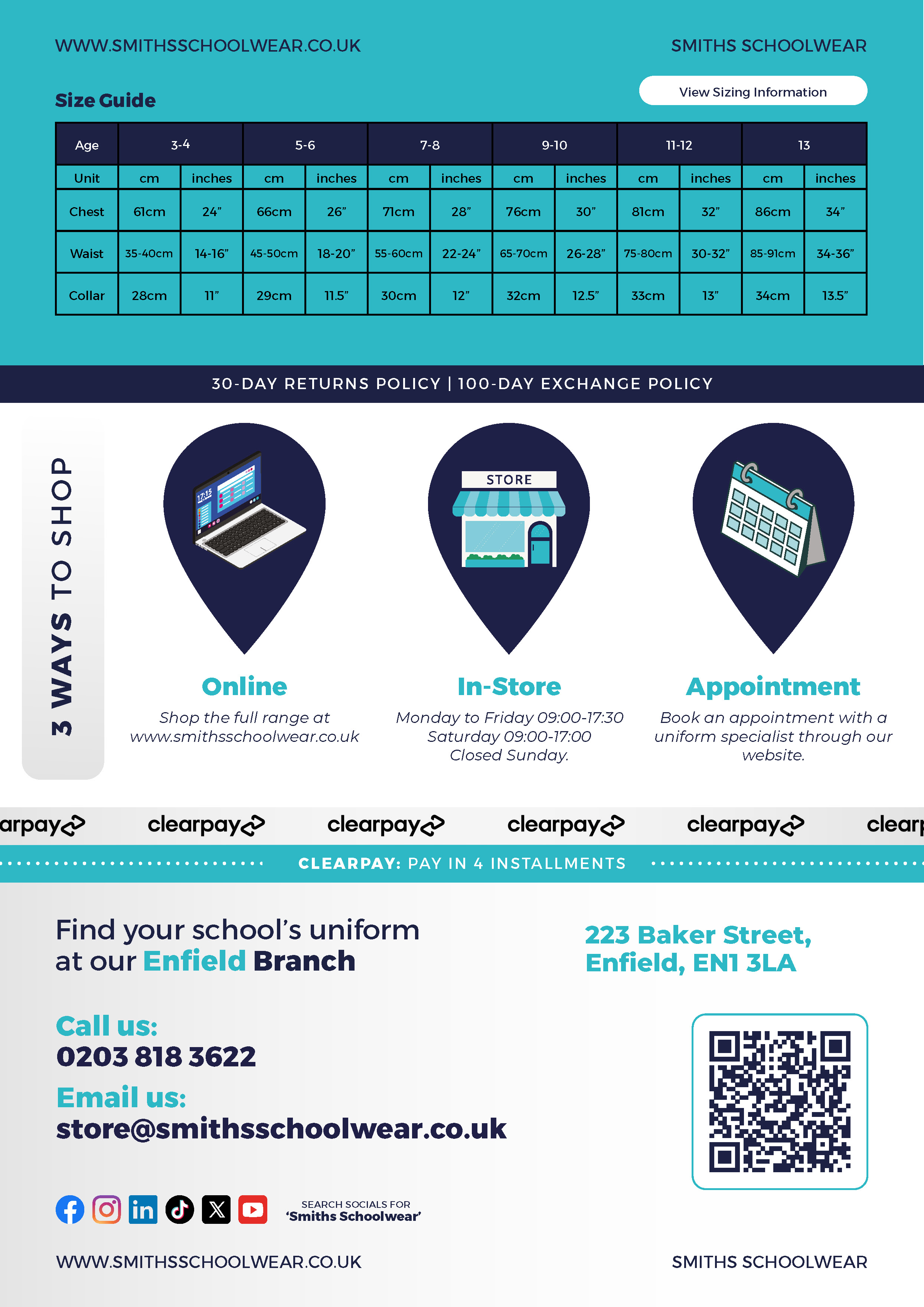 Uniform can be purchased from Smiths Schoolwear, 155-157 Lancaster Road, Enfield EN2 0JN.