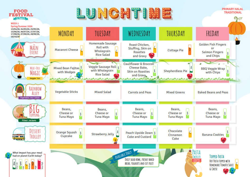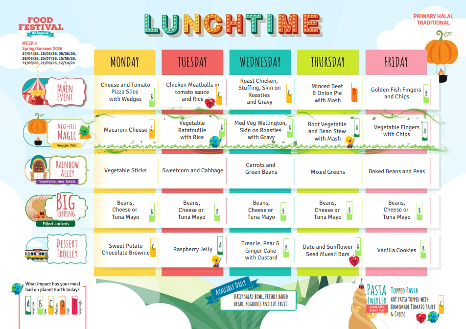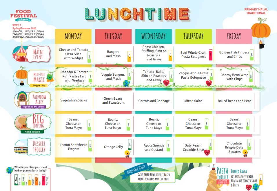 As we are a Healthy Eating school, we expect pupils to eat a range of foods. We encourage pupils to do this if they choose school meals and we expect pupils to bring packed lunches from home that reflect healthy eating too. See our menu below, please note that it is subject to changes.